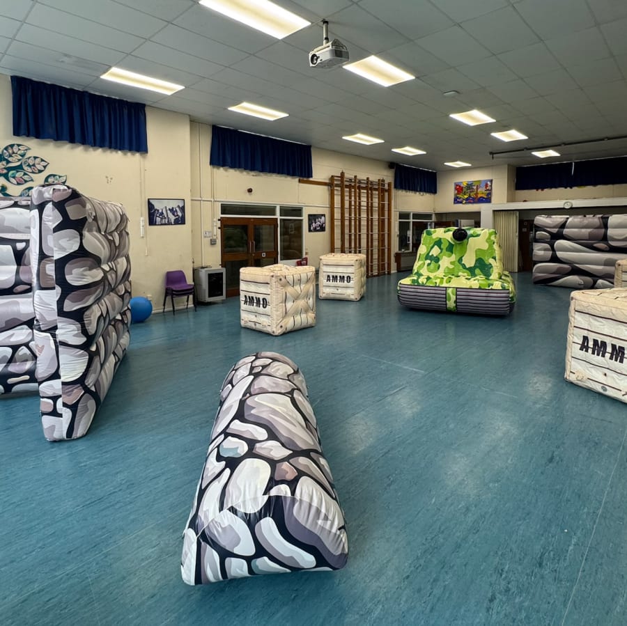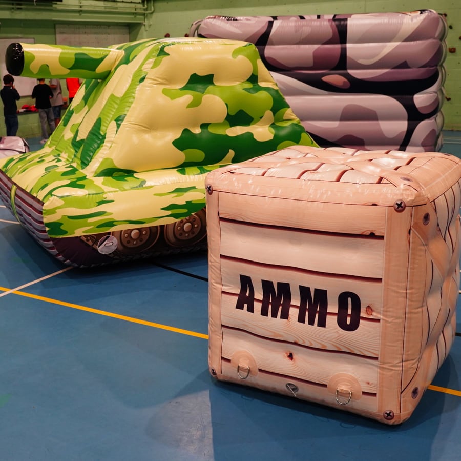 Inflatable obstacles create immersive, photo-ready battlefields.